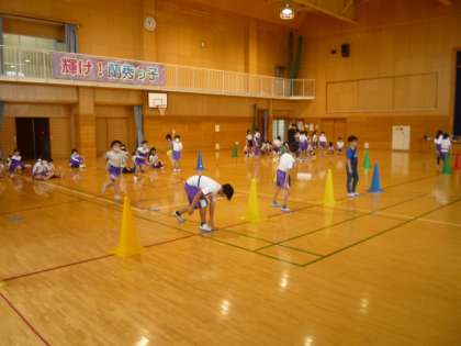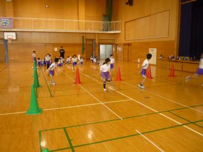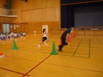 リレーの練習です。ネコとネズミになって、ネズミがネコにフラッグを捕られないように逃げています。どこでスタートを切ればいいか考えてます。