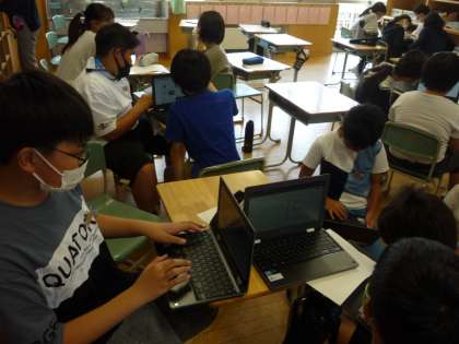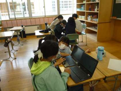 クロムブックを活用しながらも、グループでの話合いも大切にしながら、活動を進めています。