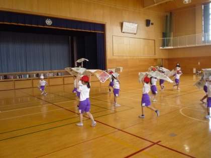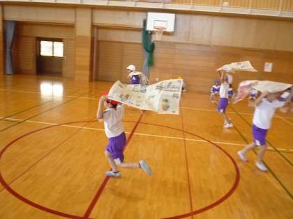 表現遊びでは、「風になりたい」の曲に乗って、新聞紙をたなびかせ風を体感しています。