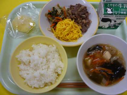 今日の献立は、ビビンバ(焼き肉・ナムル・錦糸卵)、中華スープ、冷凍りんご、牛乳 です。