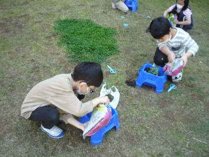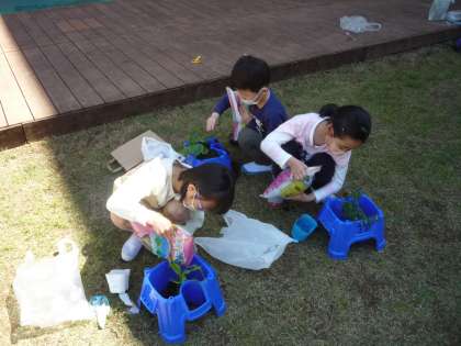 友達と協力しながら苗を植えています。友達の野菜もとても気になるようです。