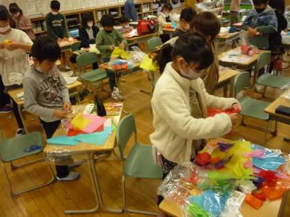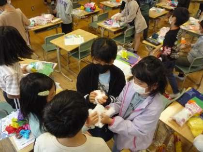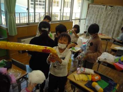 ナイロンの袋に色紙や綿を詰めて、いろいろな形を作っています。柔らかい綿の感触を生かして、かわいい動物にしている子供もいます。
