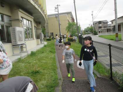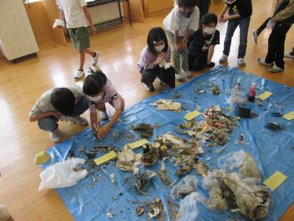 4年生の学習テーマは「環境」です。まずは、身近な環境に目を向けようと、学校の敷地内のごみを拾い集めました。集めたごみを見て、一人一人が感じたことを大切に、学習を進めていきます。