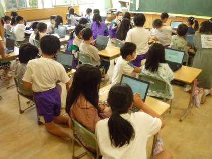 6年生に手伝ってもらいながら、クロムブックの使い方を勉強しました。パスワードの入れ方や注意することなどを教えてもらいました。