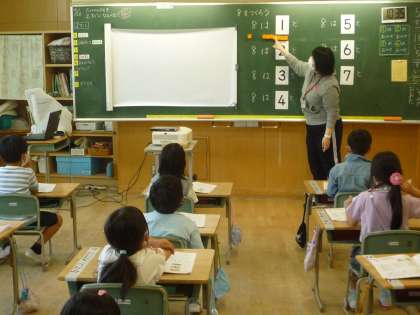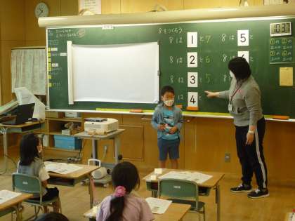 8はいくつといくつからできている数字かを、素早く答えています。机の下で指を使っている子供もいますが、おはじきやブロック等の具体物使って計算することはとても大切なことです。