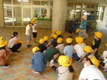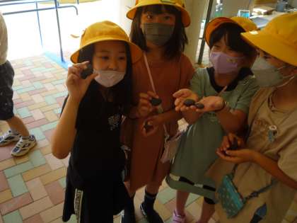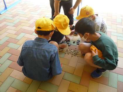 中庭の小石を並べて模様を作りました。いろいろな形の石を見つけました。