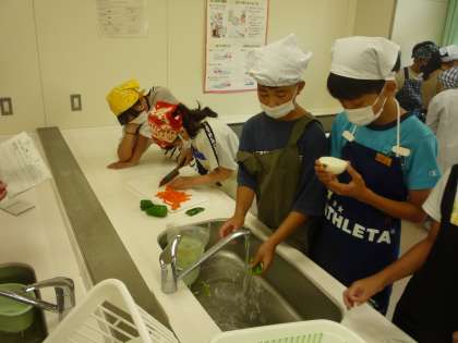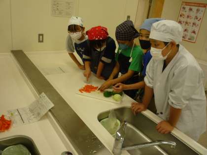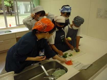 いろどり炒めに挑戦します。野菜のいろどりを出すために、切り方や炒め方に気をつかって調理しています。
