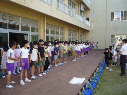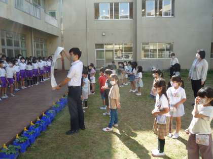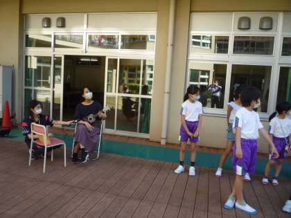 1年生が水やりを行う横で、突然4年生によるゲリラライブが始まりました。いつも学年で歌っている歌を中庭で披露しました。