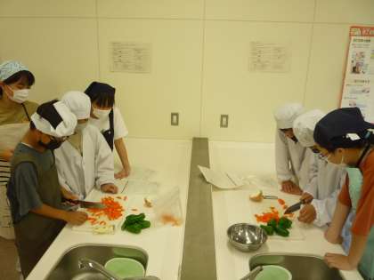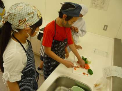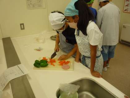 周りからのアドバイスを受けながら、上手に包丁を使い、野菜を切っています。