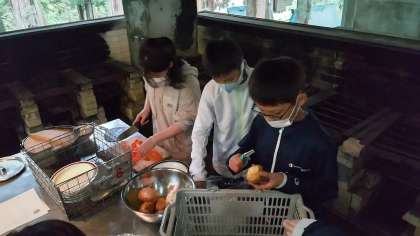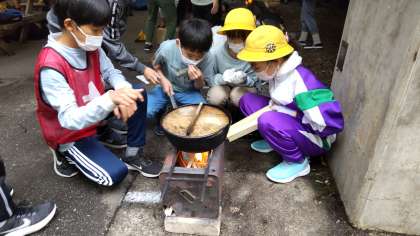 おいしいカレーライスができるかな?火の焚き付けや調理を分担して進めています。