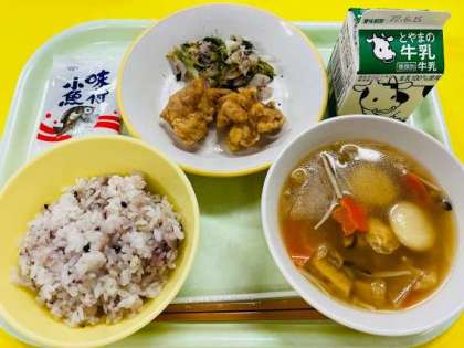 本日の給食は、雑穀入りごはん、鶏肉のから揚げ、ゆかり和え、すいとん、味付け小魚、牛乳 です。