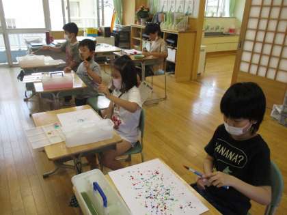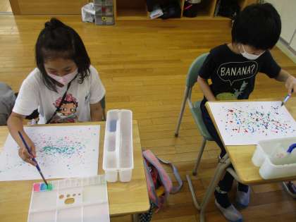 図画工作の時間に、絵の具の付いた筆を画用紙の上でふって模様を作るドリッピングに挑戦しました。絵の具が飛び散り、模様ができると「わあ、きれい」「この色、いいね」など、喜びの声をあげながらドリッピングを楽しみました。