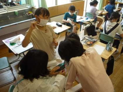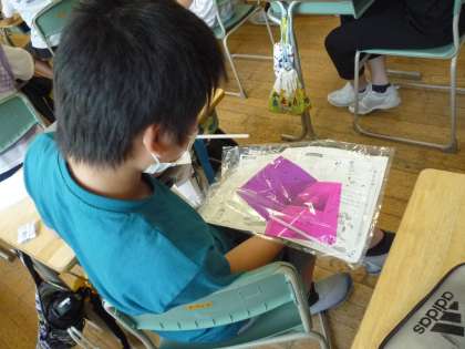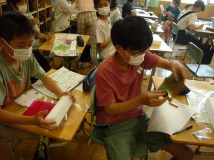 色セロハンを使って、光の彫刻を製作しています。どんな色を組み合わせればよいか考えています。