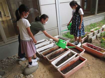 中庭改造計画が進んでいます。それぞれの活動が形となって表れてきています。花の種を植えたグループやフラワーロードにクイズを掲示したグループがありました。