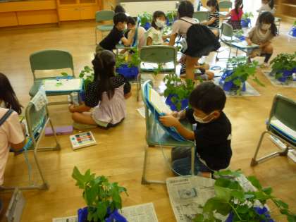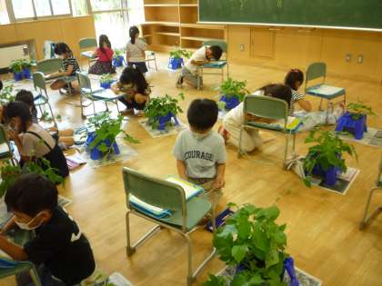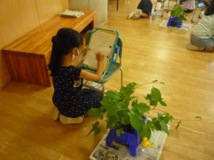 アサガオに支柱を立てます。その前に伸びてきたつるの観察です。