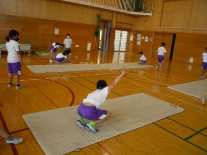 マット運動に挑戦しています。側方回転や倒立からのブリッジ等、難しい技に挑戦している子供たちもいます。