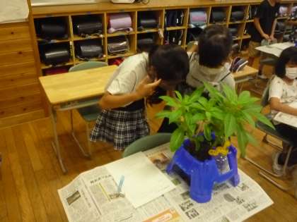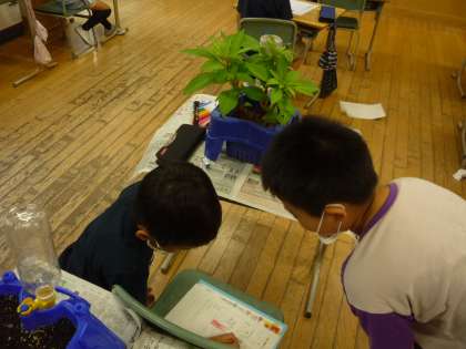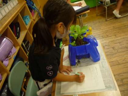 ホウセンカの観察を行いました。背丈を物差しで測ったり。葉の裏のアブラムシをどうすればいいか調べたりしています。