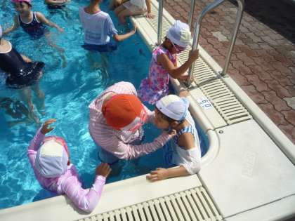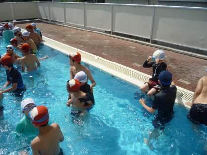 初めてプールに入りました。6年生にシャワーの浴び方や入水の仕方を教えてもらいながら入りました。6年生も優しく教えてあげています。