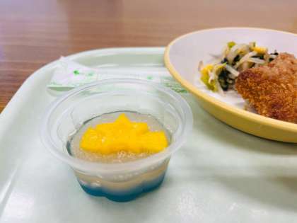今日は七夕メニューでした。天の川スープははるさめスープに星形のオクラがかわいい仕上がりです。七夕デザートは2層になって色鮮やかですね。暑い日にぴったりのデザートでした。