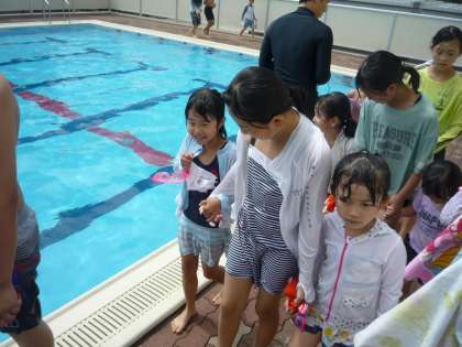 初めてプールに入りました。プールからあがった後のシャワーの浴び方や体の拭き方等、6年生に優しく教えてもらいました。