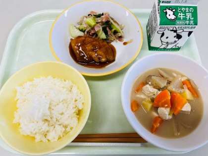 本日の献立は、ごはん、赤魚の照り焼き、チンゲンサイソテー、ごまけんちん、牛乳 です。