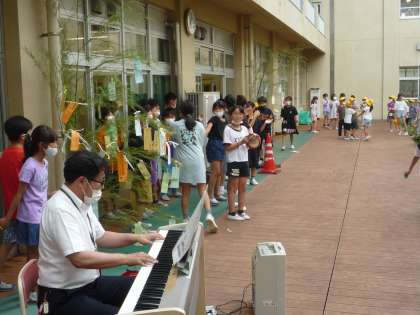 今日のハッピータイムで5年生が七夕フェスティバルを開催しました。コントや歌で盛り上がっています。