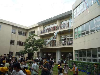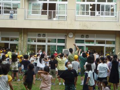 たくさんの子供たちが参加しています。2階や3階のベランダからも見ています。