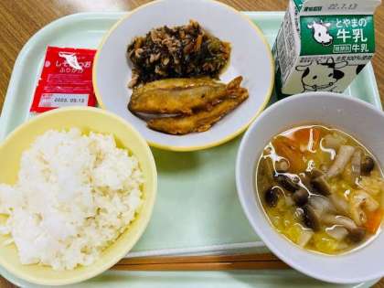本日の献立は、ごはん、わかさぎフリッター、もずくのチャプチェ、具だくさん汁、しそかつおふりかけ、牛乳 です。