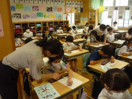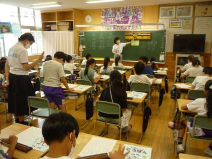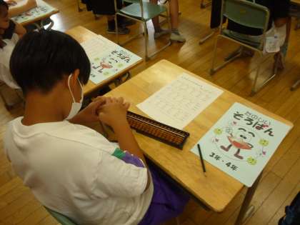 昨年度に引き続き、講師を招いてそろばん教室を行いました。3年生の時より難しい計算に挑戦しています。