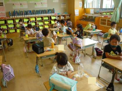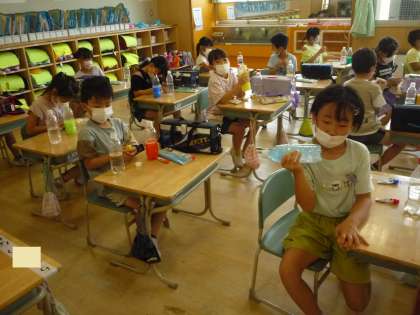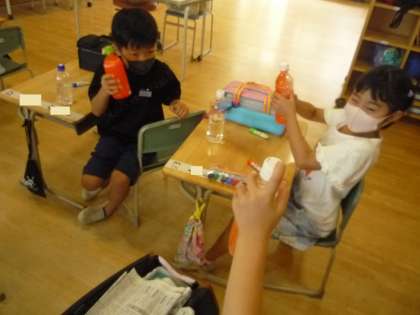 ペットボトルで色水を作りました。シェイクしてきれいな水になると歓声があがっていました。