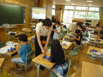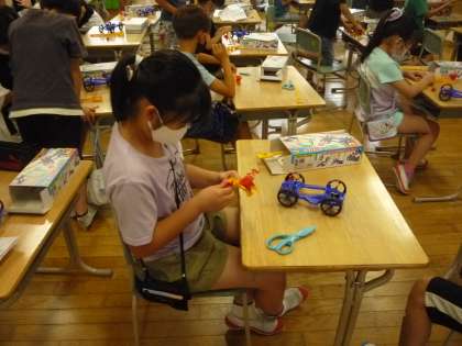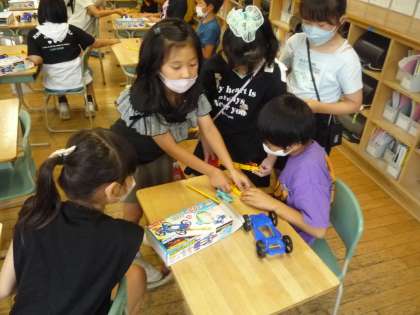 説明書を見ながらゴムカーを作成していますが、分からないことは、みんなで教え合っています。