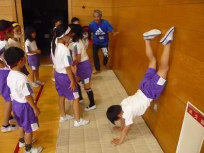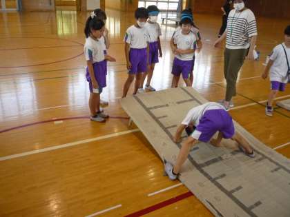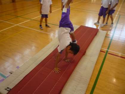 マット運動の学習では、坂マットや細マット等を使って、いろいろな技に挑戦しています。
