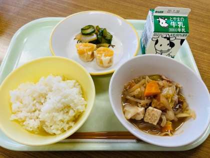 本日の献立は、ごはん、韓国風すきやき、にんじんシューマイ、昆布和え、牛乳 です。