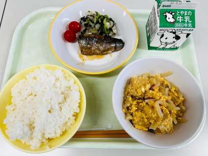 本日の給食は、ごはん、いわしのマーマレード煮、いそ和え、ミニトマト、厚揚げの錦とじ、牛乳 です。
