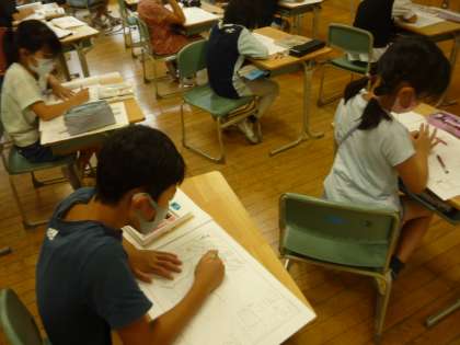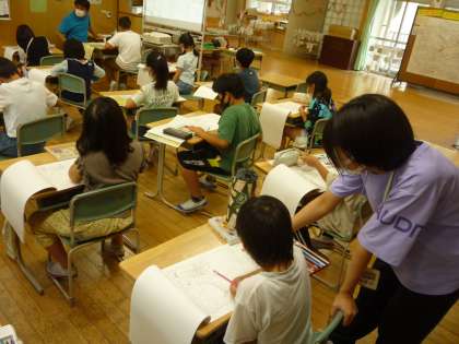 富山市の白地図に家の多い市街地や田畑が多い場所に色を塗りました。