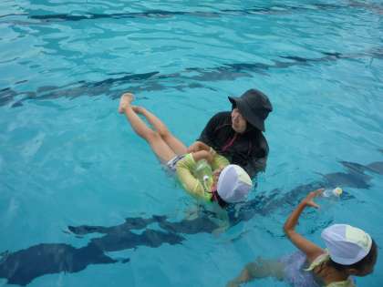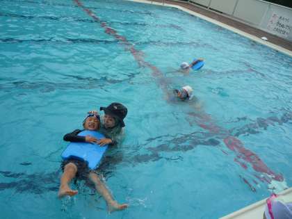 着衣泳の学習では、ラッコ浮きや背浮きを練習したり、ペットボトルやビート板を抱えて長く浮く体験をしました。
