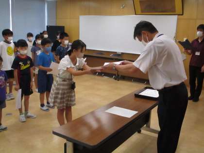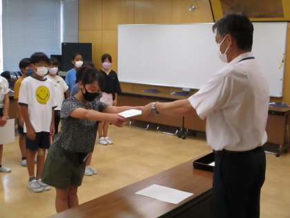 1学期にいろいろな競技で力を発揮し、好成績を収めた子供たちを紹介しました。空手、アーティスティックスイミング、ドッジポール、剣道は、この夏休みに全国大会に出場するので、激励もしました。活躍を期待しています。