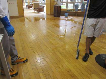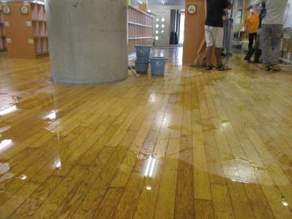 昨日の大雨により、学校一階のろうかや職員室に、水が入ってしまいました。今、教職員で、水を出したり吸い取ったりする作業をしています。