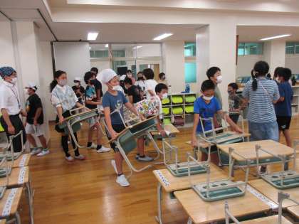 夏休み中の浸水被害により、1年教室がしばらく使用できないため、2クラスがランチルームに移動することになりました。6年生も手助けし、机等を運ぶことができました。