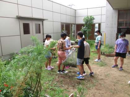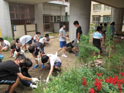 中庭の草むしりをしました。各クラスで力を合わせると、多くのゴミ袋がすぐにいっぱいになりました。みんなで協力して作業を進めました。