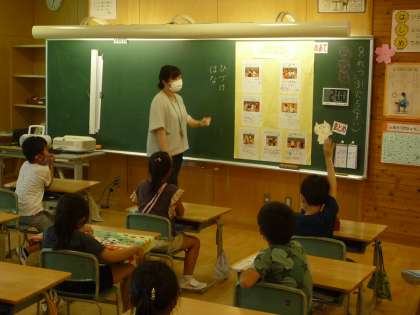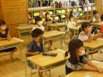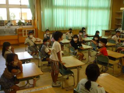 みんなが楽しく過ごすための係について話し合っています。真剣に友達の話を聞いています。