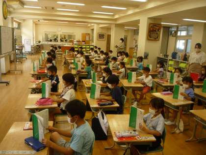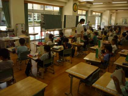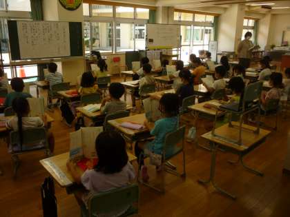 1組2組合同で国語の学習をしています。音読の練習では、みんなで声をそろえたり、交互に読んだりしました。