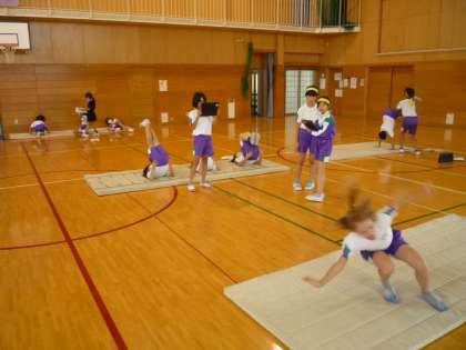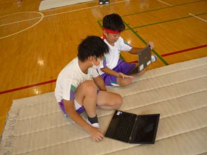マット運動の学習では、クロムブックのカメラ機能を使って、自分たちの動きを撮影しました。どこができていないのかなどを友達と助言し合っています。