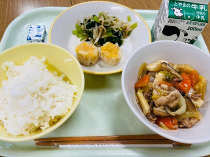 今日の献立は、ごはん、にんじんシューマイ、小松菜ひたし、八宝菜、ポケットチーズ、牛乳 です。