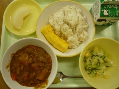 麦ごはん カレーライス 卵ロール コールスローサラダ 梨 牛乳