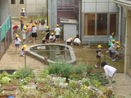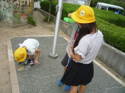 虫を探していますが、なかなかいません。見つけられたのは、だんごむしぐらいですが、子供たちは大喜びです。