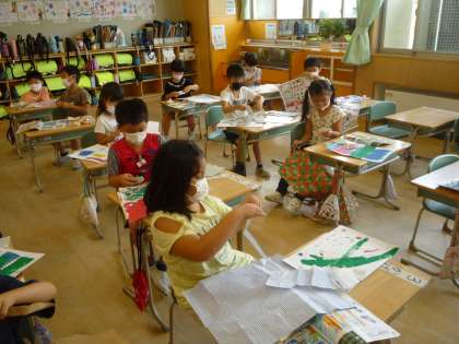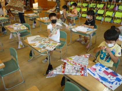 新聞紙や広告の紙を思いっきり破って、いろいろな形を作りました。その破いた紙を使って絵を描きました。