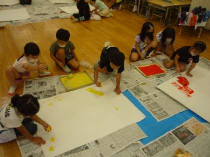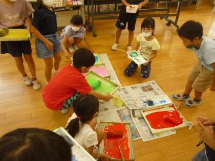 大きな紙に思いっきり、ローラーを転がしたり、ピーマンの切り口を押したりと、グループで作品づくりに取り組んでいます。