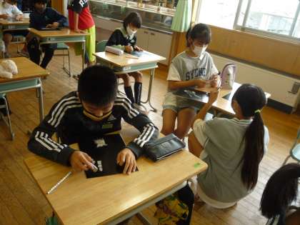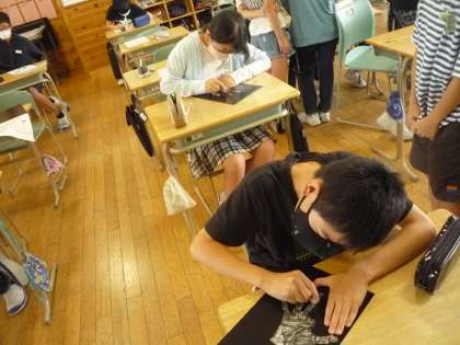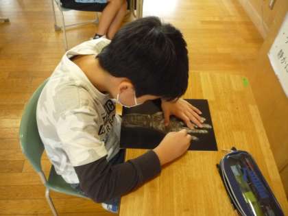 消しゴムアートで、自分の手を描きました。消しゴムでの消し具合がが難しいようです。