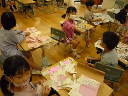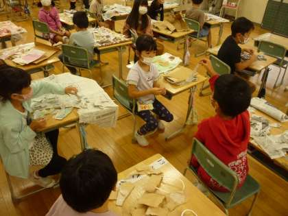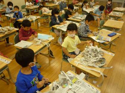 新聞紙や広告、包装紙をびりびり破き、破いた紙を使って絵を描きます。